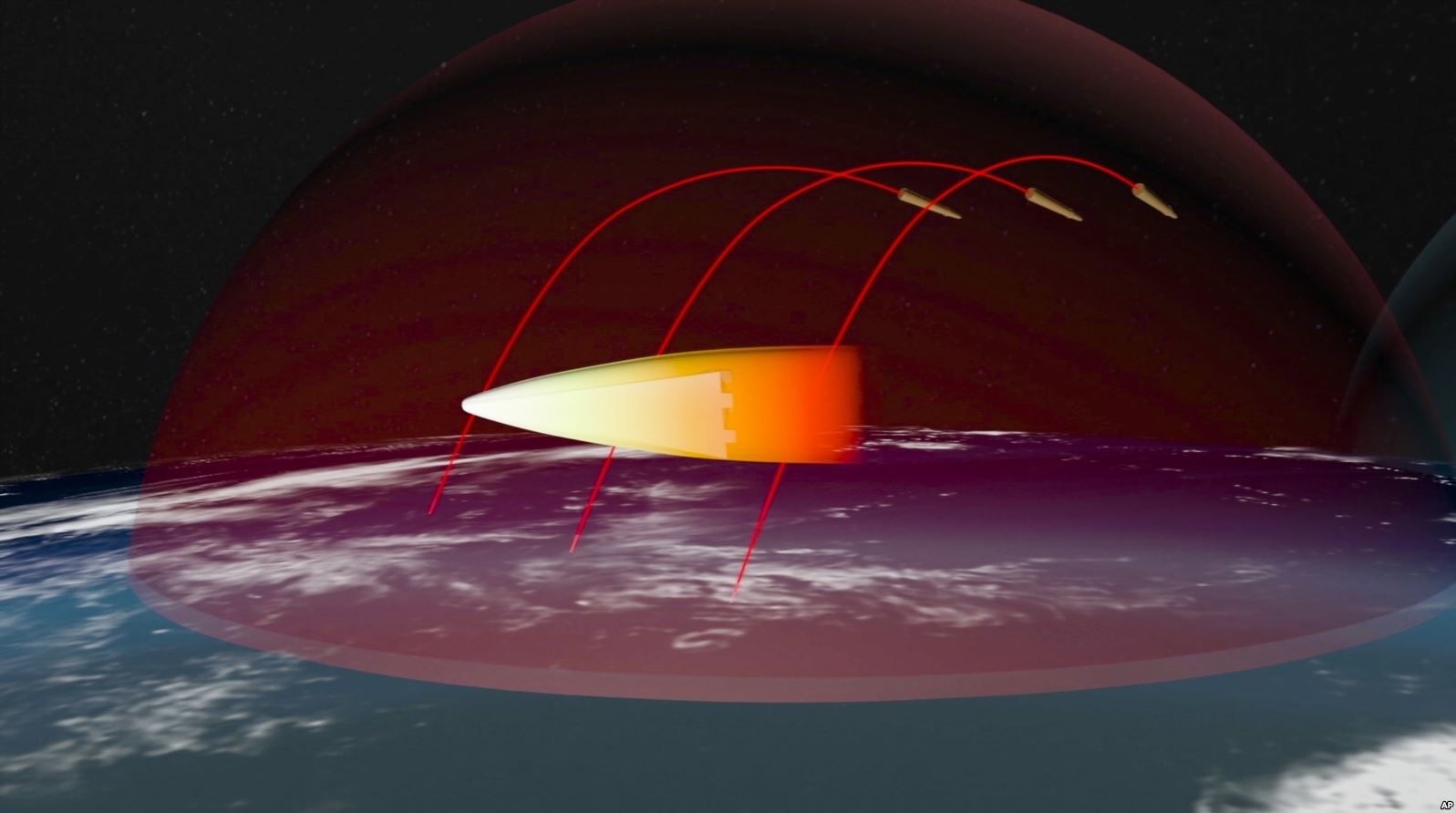 In this video grab provided by RU-RTR Russian television via AP television, March 1, 2018, a computer simulation shows the Avangard hypersonic vehicle maneuvering to bypass missile defenses en route to target.