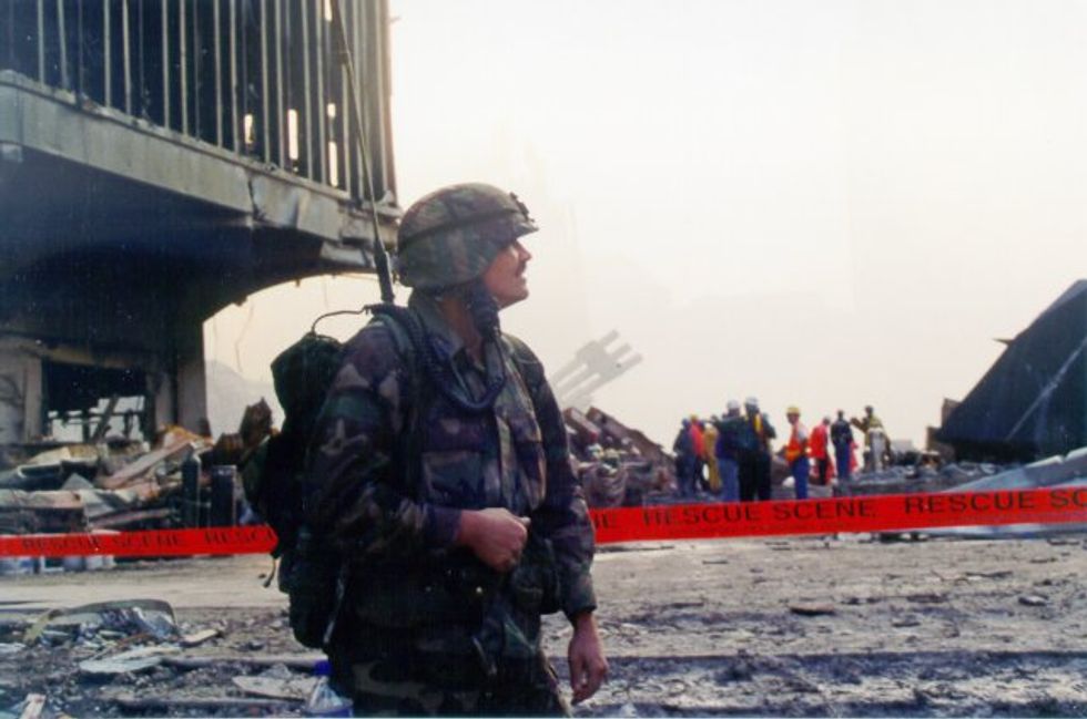 New York Army National Guard Spc. Christian Miller from Company C, 1st Battalion, 105th Infantry, surveys ground zero devastation Sept. 13, 2001, two days after the 9/11 terror attacks. | Photo Credit: Col. Richard Goldenberg, New York Army National Guard