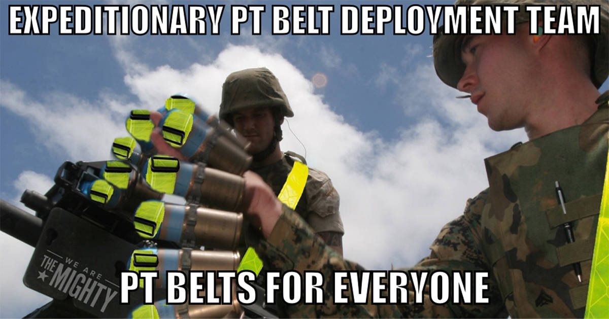 When troops are under fire, conducting an assault, or just running on a dark street and find themselves without a reflective or glow belt, the Expeditionary PT Belt Deployment Team is there to lend a hand and 6 feet of reflective plastic.