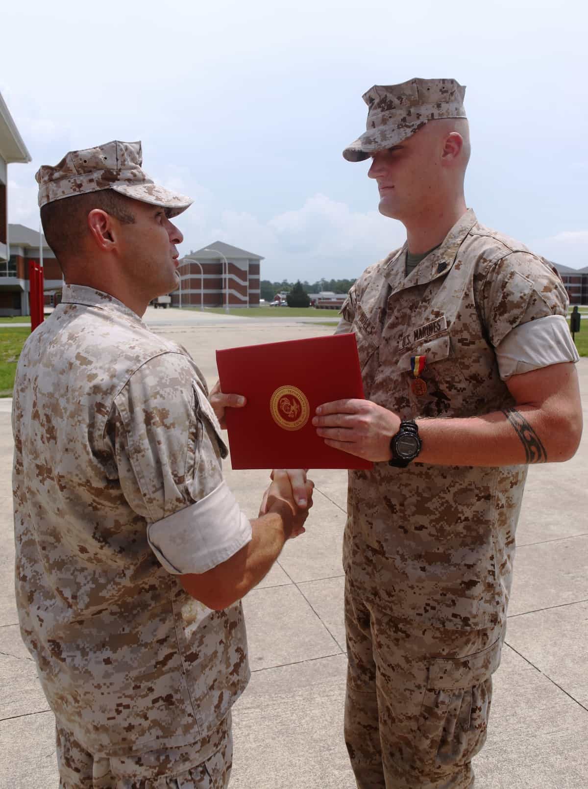 According to a Marine Corps release, these Marines received their Navy and Marine Corps Medals on the same day, June 23, 2009. The previous year, each had saved recruits when mishaps took place during grenade training. The Military Times Hall of Valor notes that Kuehnl’s actions took place on Oct. 31, 2008, while Martin’s took place on Sept. 12, 2008.