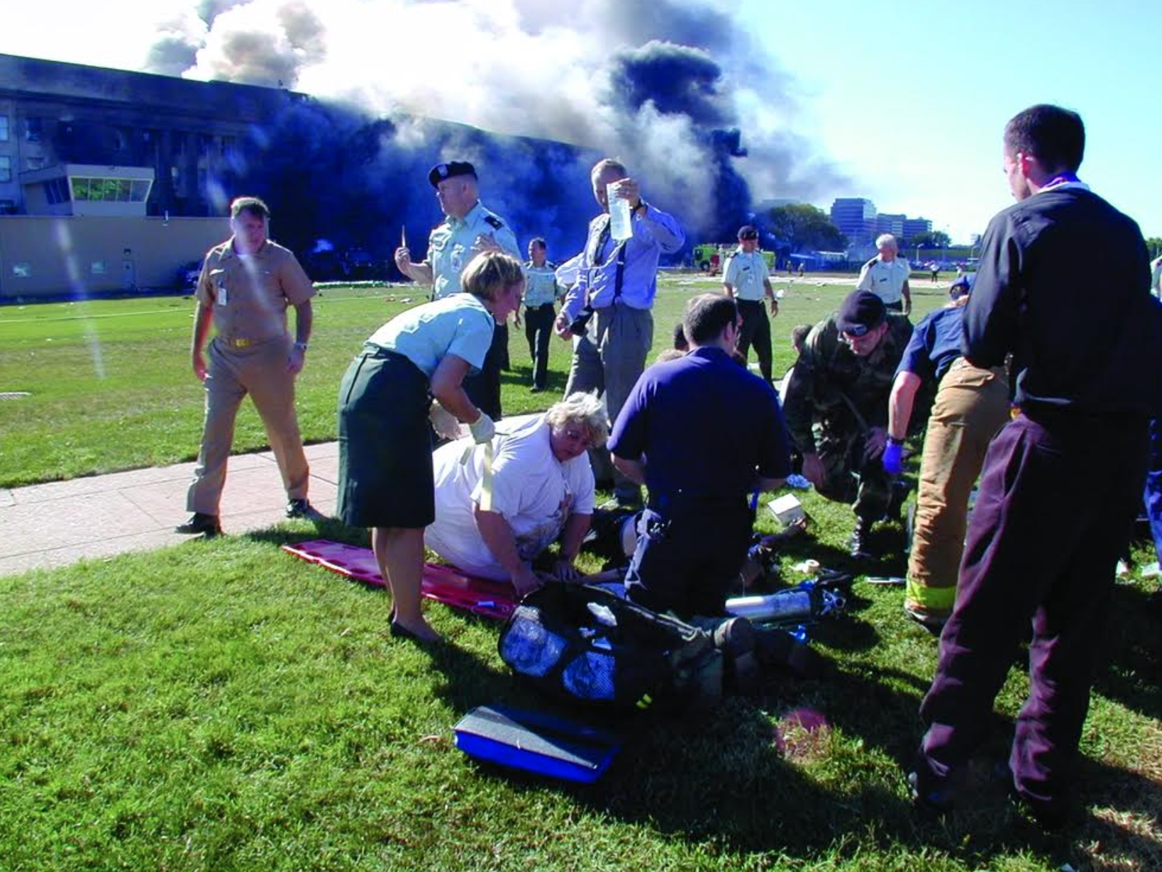The Courtyard was an incredible sight. Over a thousand military, civilian and contractor personnel stood or sat silently, their eyes trained toward the sky. Again, I was struck by the calm and the orderliness of it all. Finally, a civil defense officer appeared with a bullhorn, asking everyone to move out into the South parking lot. I thought I would join the crowd, but I noticed the Pentagon health clinic professionals setting up a triage area there in the Courtyard. Since I had received first aid training many times over the years, I thought I would remain for awhile to assist as needed.