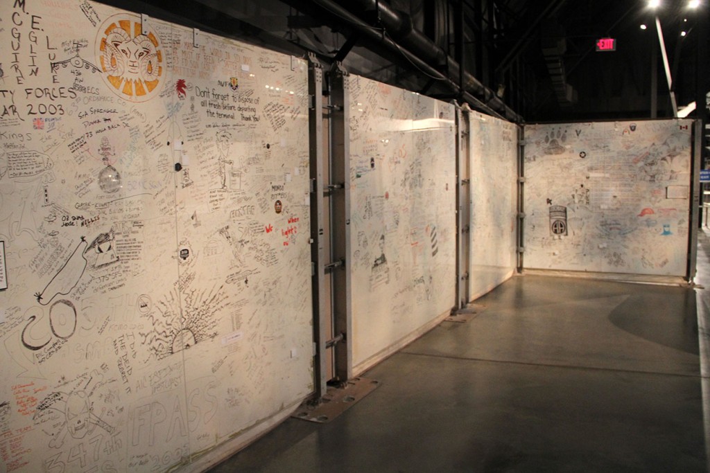 I don’t know about how any other post-9/11 veterans feel about seeing themselves in museums. For me, museums have traditionally held stories from faraway places and some very old things. So it’s a strange feeling to see your own war already immortalized in a museum. Though admittedly, there isn’t much to this exhibit save for what a tent city DFAC looks like from the outside and the wall of the Air Terminal Operations Center from al-Udeid Air Base, Qatar from 2003. What’s interesting about the wall is that many of those who deployed in support of Desert Storm, Operation Iraqi Freedom and Enduring Freedom went through this passenger terminal, and many of those wrote and drew on the drywall supporting the tent. It’s interesting to think of how the wars our current troops are fighting will be remembered in the future.