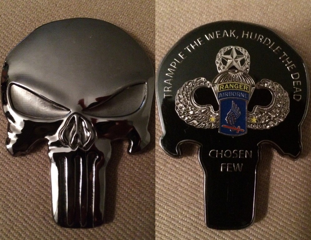Most units, especially in the Army and Marine Corps, go aggressive. But this Airborne infantry coin went the extra mile to remind everyone that the infantry has one job and Chosen Company, 173rd Airborne Brigade plans on being good at it.