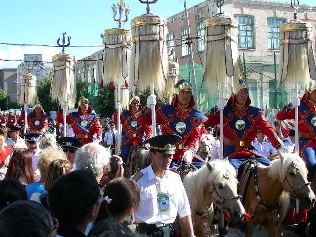 The uniforms are meant to harken back to the days of the Mongol Empire, as is the white staff with yak hair. The staffs are called tug banners and are white during times of peace, black during times of war. Large processions like this are typically done before Nadaam, the Mongolian independence celebration.