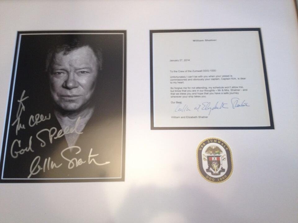“Unfortunately I can’t be with you when your vessel is commissioned and obviously your captain, Captain Kirk, is dear to my heart,” Shatner wrote. “So forgive me for not attending, my schedule won’t allow me, but know that you are in our thoughts — Mr. Mrs. Shatner — and that we bless you and hope that you have a safe journey wherever your ship takes you.”