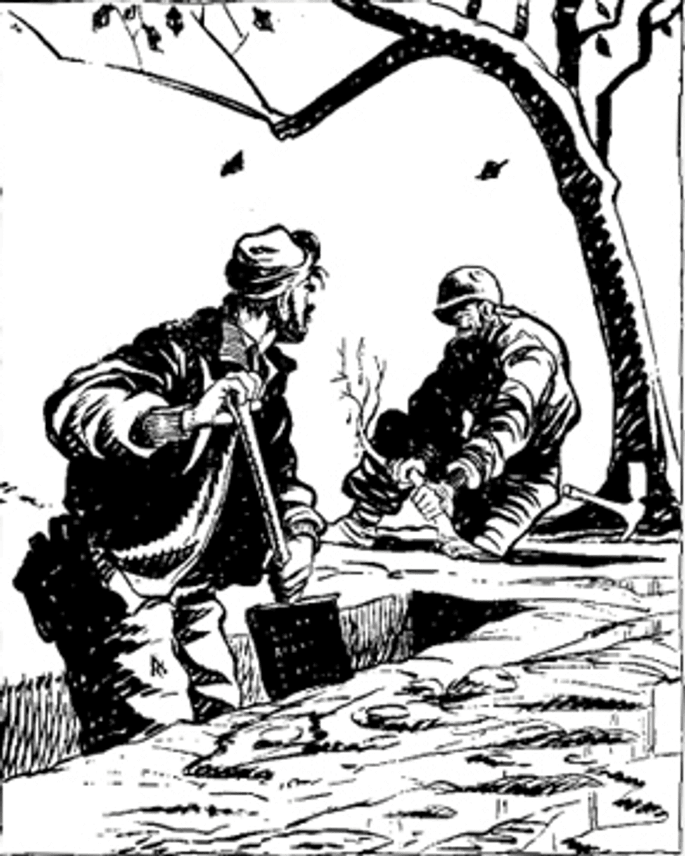 Drawn by Army Sgt. Bill Mauldin, Willie and Joe were characters Mauldin used often to show the rigors in the field. Originally assigned to the 45th Infantry Division, Mauldin was soon assigned to the Stars and Stripes for which he drew six cartoons a week. His cartoons got him in serious trouble with Gen. George S. Patton, but the troops loved his work, especially the war weary Willie and Joe.