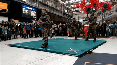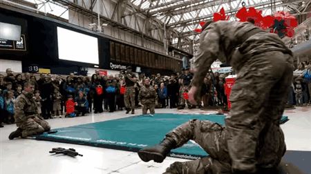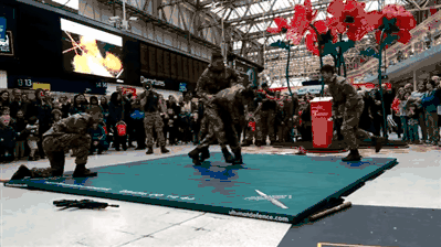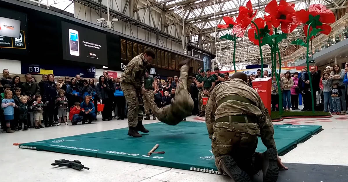 This 2015 demonstration was held at the Waterloo station in London and featured four Marines fighting and a few announcing, answering crowd questions, and collecting funds for Remembrance Sunday.