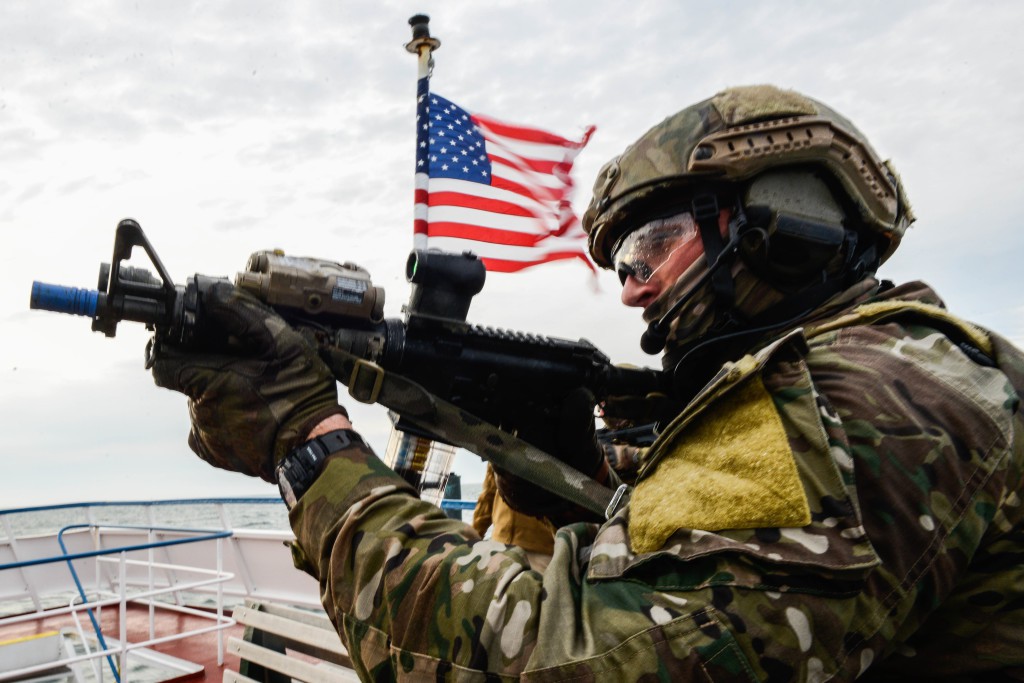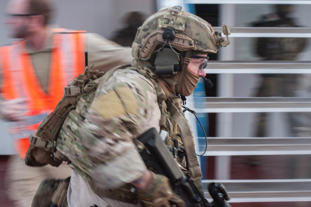 A Maritime Security Response Team member pulls security during a ferry boarding in an exercise Oct. 22, 2015.