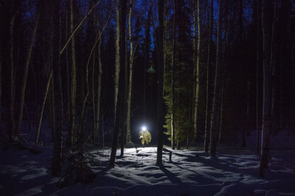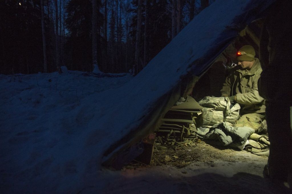 Staff Sgt. Joseph Reimer unpacks his duffle bag during the first night of arctic field training near Eielson Air Force Base, Alaska. The course is five days in duration with instruction in familiarization with the arctic environment, medical, personal protection, sustenance and signaling. Reimer is an explosive ordnance disposal technician assigned to the 354th Civil Engineer Squadron