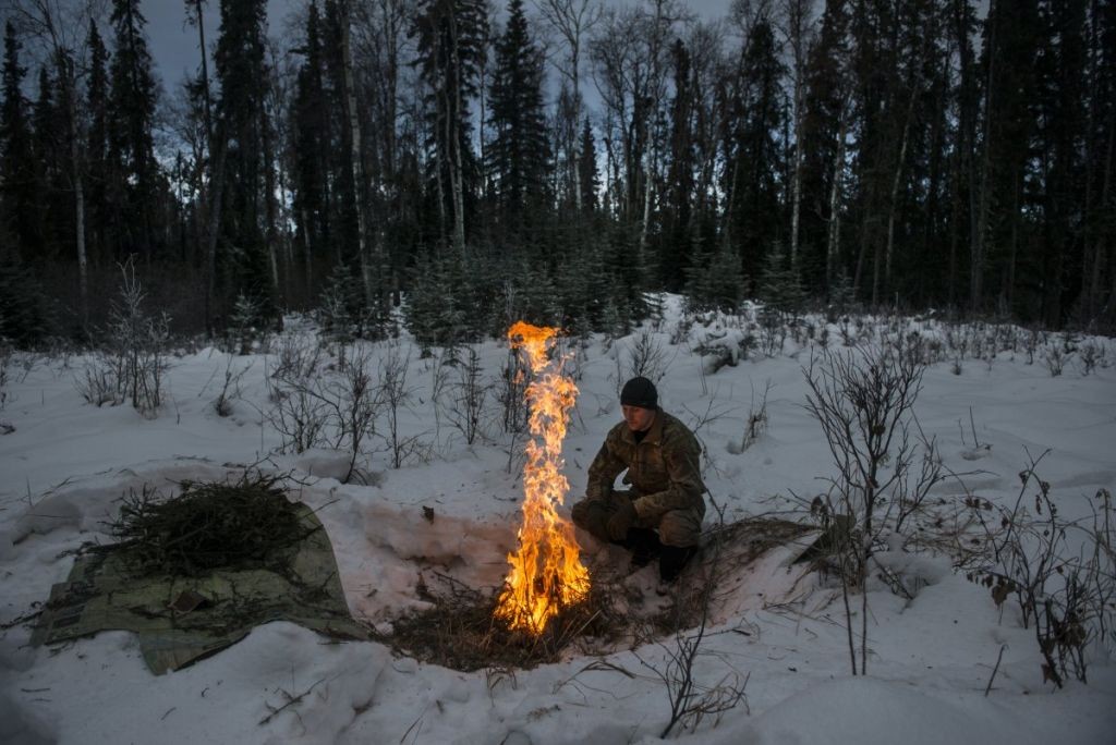 Staff Sgt. Seth Reab ignites a flare in the middle of tender wood to create a smoke signal during a field training lesson at Eielson Air Force Base, Alaska. The signal flare can be seen for up to 10 miles away and much further when rescue help is coming through the air. Reab is an Air Force Arctic Survival School instructor assigned to Det. 1, 66th Training Squadron at Eielson AFB.