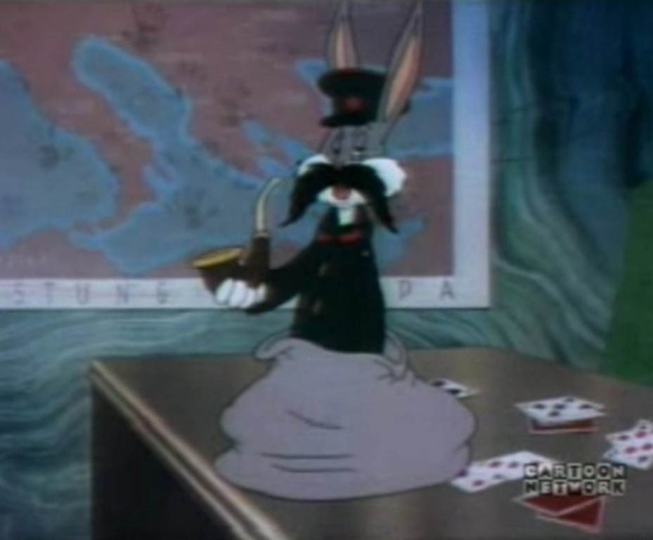In a particularly daring raid, Daffy flew into a rally of Nazi party members and struck Adolf Hitler on the head with a large hammer.