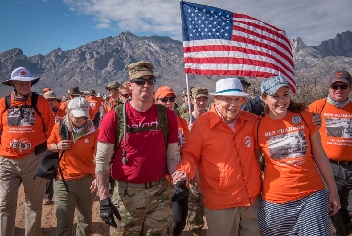 In 2006, at the age of 88, Skardon became the only Bataan Death March survivor to walk in the annual Bataan Memorial Death March at White Sands Missile Range, New Mexico. He walked over eight miles in his first event and returned to walk 12 more times. Skardon walked his last Memorial March at the age of 101. In 2020, the Memorial March was cancelled. However, Clemson students, alumni, and veterans organized the Clemson 8 Challenge to honor the eight Clemson alumni who survived the Death March in 1942 and carry on Skardon’s mission of honoring the men who made the ultimate sacrifice. At the age of 103, Skardon walked more than three miles for the event.