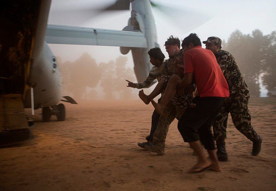 A U.S. Air Force pararescueman with Joint Task Force 505 helps evacuate earthquake victims from an area near Cherikot, Nepal, after a 7.3 magnitude earthquake struck the country, May 12. JTF 505 along with other multinational forces and humanitarian relief organizations are currently in Nepal providing aid after a 7.8 magnitude earthquake struck the country, April 25. At Nepal’s request the U.S. government ordered JTF 505 to provide unique capabilities to assist Nepal. (U.S. Marine Corps photo by Jeffrey D. Anderson)