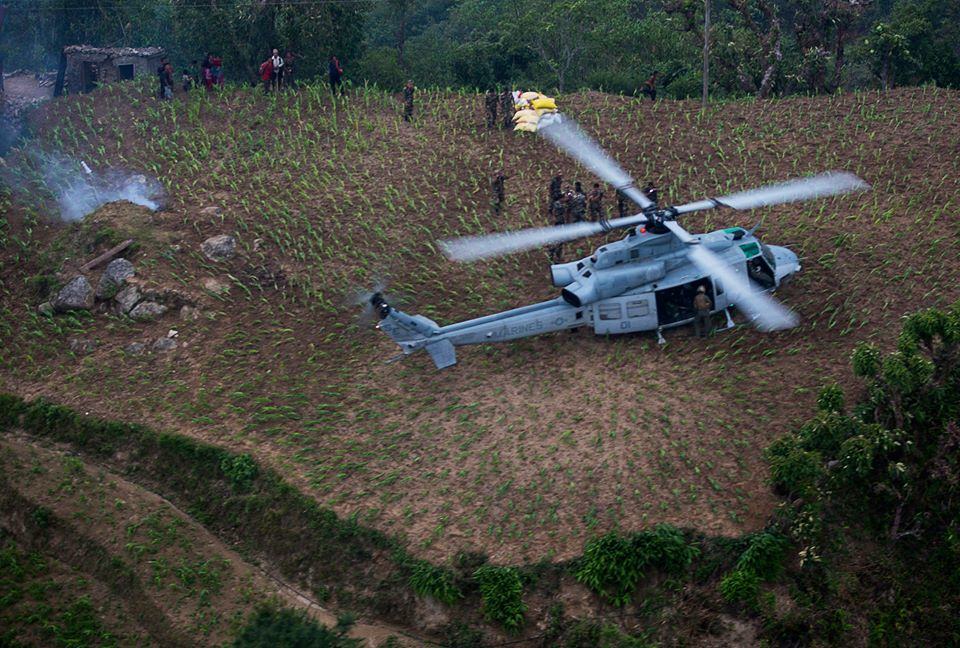 Nepalese army soldiers unload aid and relief supplies, delivered by Joint Task Force 505, from a UH-1Y Venom in the Kavrepalanchowk District, Nepal, May, 11, during Operation Sahayogi Haat. The Nepalese Government requested the U.S. Government’s assistance after a 7.8 magnitude earthquake struck the country, April 25. The U.S. government ordered JTF 505 to provide unique capabilities to assist Nepal. (U.S. Marine Corps photo by Jeffrey D. Anderson)