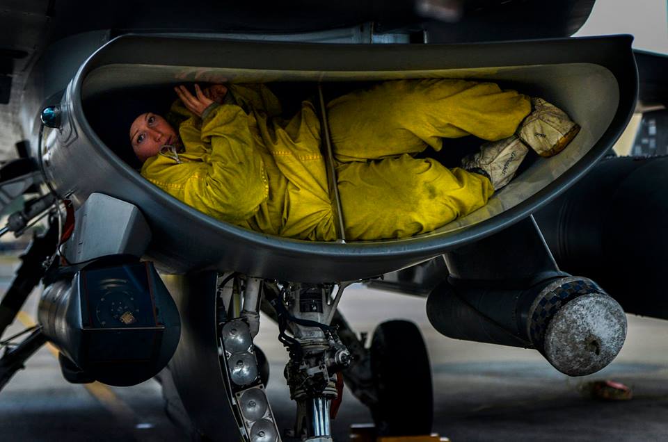 A U.S. Air Force crew chief assigned to the 77th Fighter Squadron, crawls out of the intake of an F-16 Fighting Falcon as she completes her post flight inspection on the aircraft, Jan. 15, 2015, Shaw Air Force Base, S.C. Crews chiefs work around the clock to keep Shaw’s fleet of F-16 Fighting Falcons mission ready at all times.(U.S. Air Force photo by Staff Sgt. Kenny Holston)