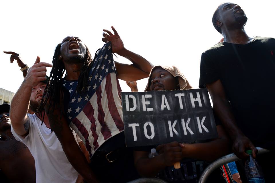 Dueling demonstrations clash as the Klu Klux Klan holds a protest rally on the steps of the S.C. State House building at the same time as a New Black Panther Party rally coupled with other black activist groups, July19, 2015, Columbia, S.C. The KKK held the rally to protest against the removal of the Confederate Flag from the State House grounds which was taken down July 10, 2015. The demonstration groups nearly went head-to-head as both rallies concluded and ended up face-to-face in the streets of downtown Columbia. In this photo young African American men push past medal barricades which are the only thing between them and several KKK members as they shout at the Klan members to leave or die. (U.S. Air Force photo by Staff Sgt. Kenny Holston)