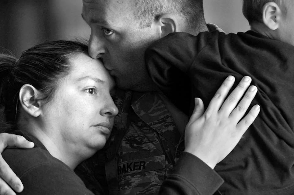 U.S. Air Force Staff Sgt. Brett Baker, assigned to the 20th Fighter Wing, kisses his wife before leaving for a deployment from Shaw Air Force Base, S.C., Oct. 6, 2015. Members of the Air Force typically deploy several times throughout their career, often times leaving family members behind. (U.S. Air Force photo by Senior Airman Jensen Stidham)