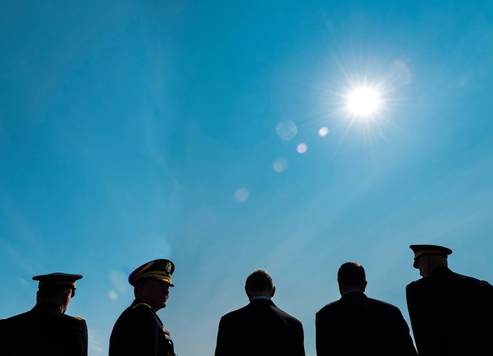 38th Chief of Staff of the Army Gen. Raymond T. Odierno, Secretary of Defense Ashton B. Carter, Secretary of the Army John M. McHugh, 18th Chairman of the Joint Chiefs of Staff Gen. Martin E. Dempsey, and 39th Chief of Staff of the Army Mark A. Milley stand in line prior to the start of the United States Army Change of Responsibility ceremony held at Summerall Field on Fort Myer, Va., Aug. 14, 2015. Gen. Raymond T. Odierno relinquished command of the U.S. Army to Gen. Mark A. Milley during the ceremony hosted by Secretary of the Army John M. McHugh. (U.S. Army photo by Staff Sgt. Sean K. Harp)