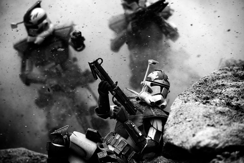 Advanced Recon Commandos rush to cover after being ambushed by separatist forces. The troopers were conducting a security patrol outside their company forward operating base when the droid forces attacked. This image of 12-inch action figures is part of a larger photo essay telling the stories of the rank-and-file ground troops of the Star Wars universe through the lens of a combat correspondent. Conflict generally has been one of the biggest informants in the way pop culture creates stories. This photo essay, entitled “Galactic Warfighters” tethers the real and fictitious worlds more closely to each other. All elements of this image were captured in-camera. The image was converted to black and white with a contrast adjustment, sharpening and minor burning of the vignetted edges in post. (U.S. Marine Corps illustration by Sgt. Matthew Callahan)