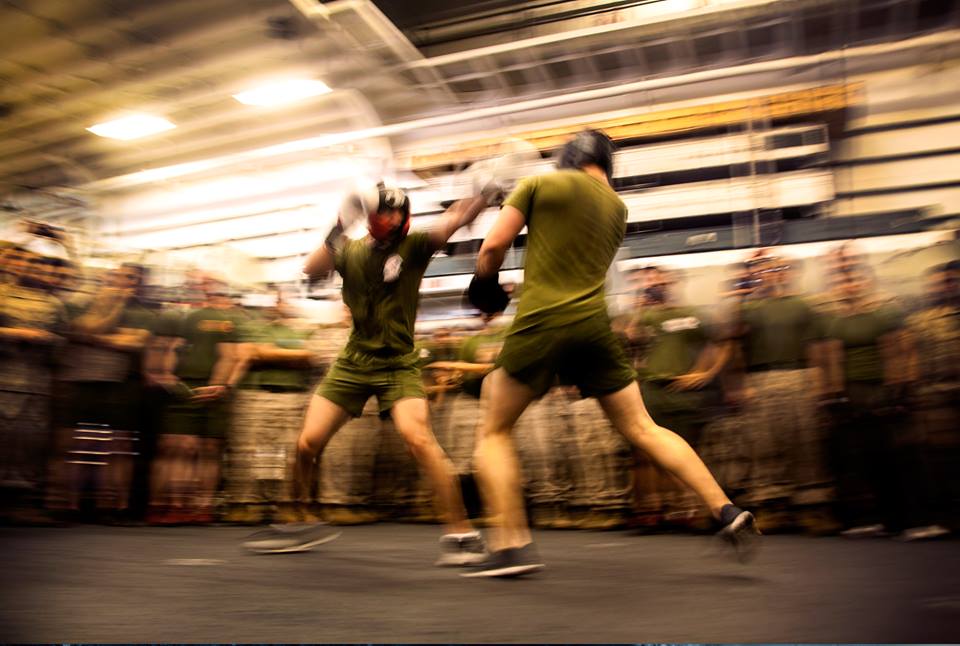 U.S. Marine Cpl. Roman Fernandez, left, and 1st Lt. Paul Hollwedel duke it out in the hangar bay of the USS Essex (LHD 2) at sea in the Pacific Ocean, May 29, 2015. Fernandez is a team leader and Hollwedel is the executive officer with Lima Company, Battalion Landing Team 3rd Battalion, 1st Marine Regiment, 15th Marine Expeditionary Unit. The Marines found unique ways to continue to maintain combat readiness during their seven-month deployment through the Pacific and Central Command areas. U.S. Marine Corps photo by Cpl. Elize McKelvey)