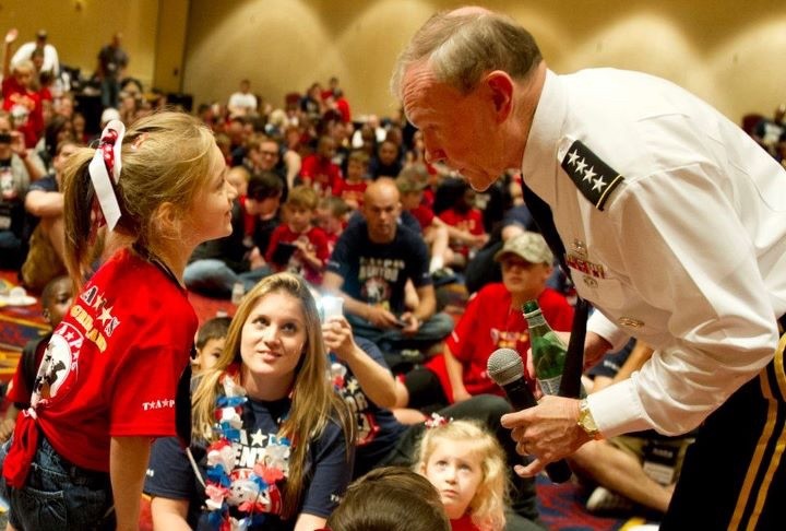 “I walked into this room with 600 kids all wearing big round buttons with images of their parents, and I knew I was ill-prepared,” Gen. Dempsey said. “It was emotionally overwhelming. It’s hard enough meeting a single family that’s had a loss. It’s another thing altogether meeting 600 families.”