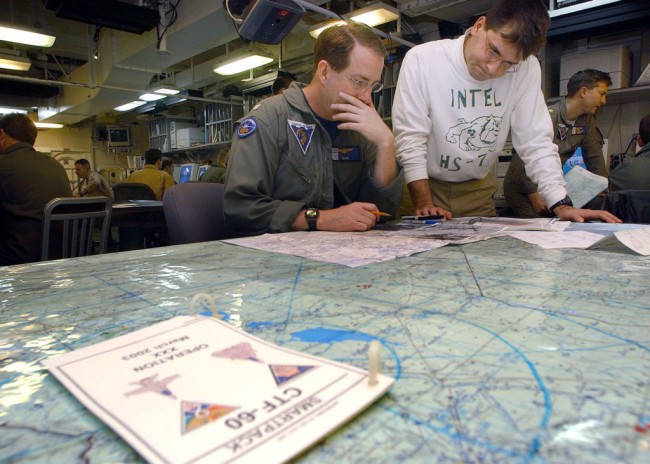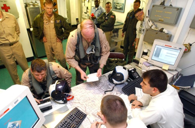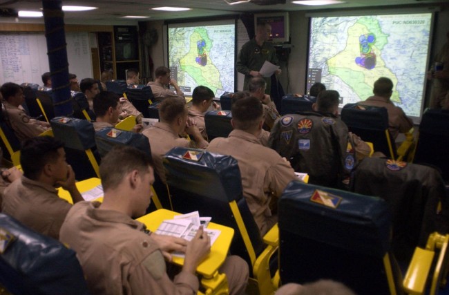 The mission cycle begins with CENTCOM’s Joint Task Force sending the tasking order to the intelligence center on the aircraft carrier. From there, the air wing operations cell assigns sorties to the appropriate squadrons, and those squadrons in turn assign aircrews to fly the sorties. At that point aircrews get to work with intel officers and start planning every detail of the sortie.
