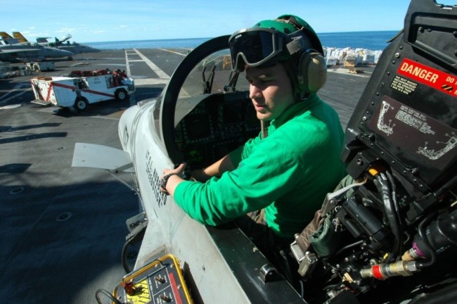 Once satisfied that the jet is ready, crews climb in and wait for the Air Boss in the tower to give them the signal to start ’em up.