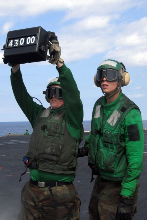 With the throttles pushed to full power and the controls cycled to make sure they’re moving properly, the pilot salutes the cat officer. The cat officer touches the deck, signaling the operator in the catwalk to fire the catapult.