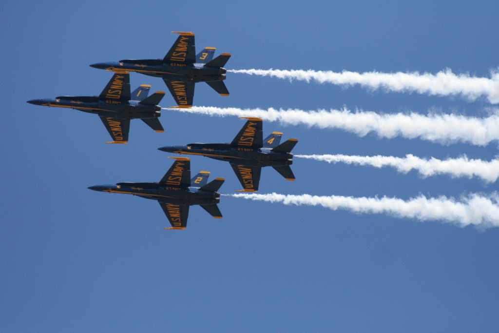 During the show, Blue Angels jets do something other fleet jets don’t do under normal circumstances: They trail smoke. That dramatic effect is created when special chemicals mix with the air behind the plane. Creating that effect is the “smoke” part of Kindley’s concerns.