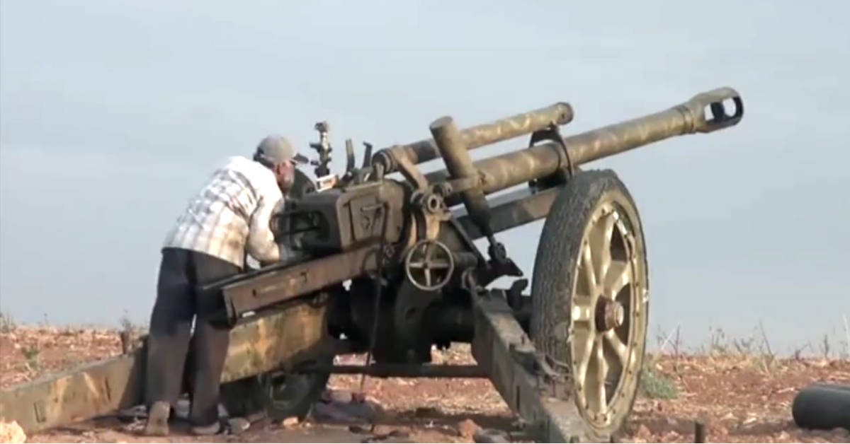 The video description doesn’t identify who is operating the weapon, but it is likely the Syrian rebels. They’ve used this tactic before. A video surfaced in May 2015 showing them using Wehrmacht artillery and they’ve also pressed valuable, antique German guns into service. And the artilleryman’s clothing bears some striking differences from government uniforms.
