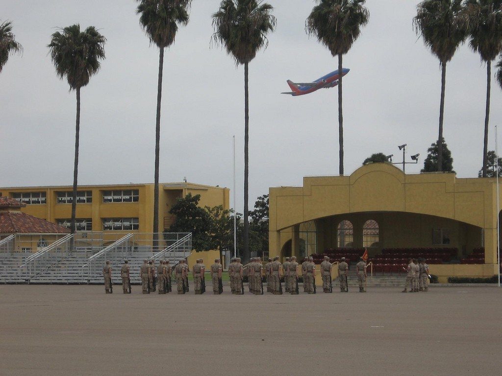 No matter how long or short your flight is from your home to MCRD, the drive from the airport to base is a mere five minutes. By checking out this Google satellite view you can see that the base is literally on the opposite side of the runway fence. At first the constant deafening noise of airplanes taking off and landing every few minutes is annoying, but recruits get used to it real quick. In fact, some use it to their advantage, by counting the planes as if they were sheep to go to sleep at night dreaming about their next flight home. Recruits endure the mental kick in the stomach while running along side the runway fence watching planes take off with happy newly graduated Marines and their families.