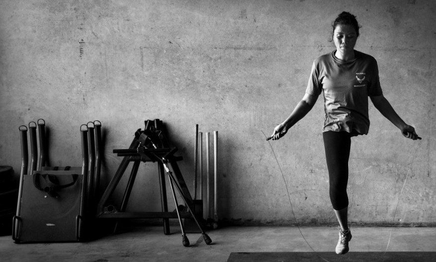 US Air Force Capt. Sarah Evans jumps rope in a gym in San Antonio, Texas. Evans was diagnosed with cancer while deployed to Afghanistan and was medically evacuated back to the United States where her leg was amputated.