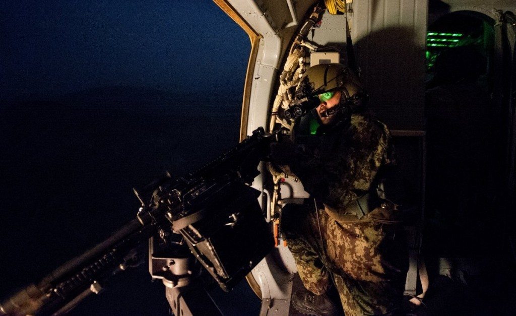 An Afghan Air Force (AAF) Mi-17 aerial gunner fires an M-240 machine gun while flying over a weapons range March 13, 2014, near Kabul, Afghanistan. US Air Force Airmen from the 438th Air Expeditionary Wing/NATO Air Training Command-Afghanistan flew a night-vision goggle training mission with an AAF aircrew to further increase the operational capability of the AAF.