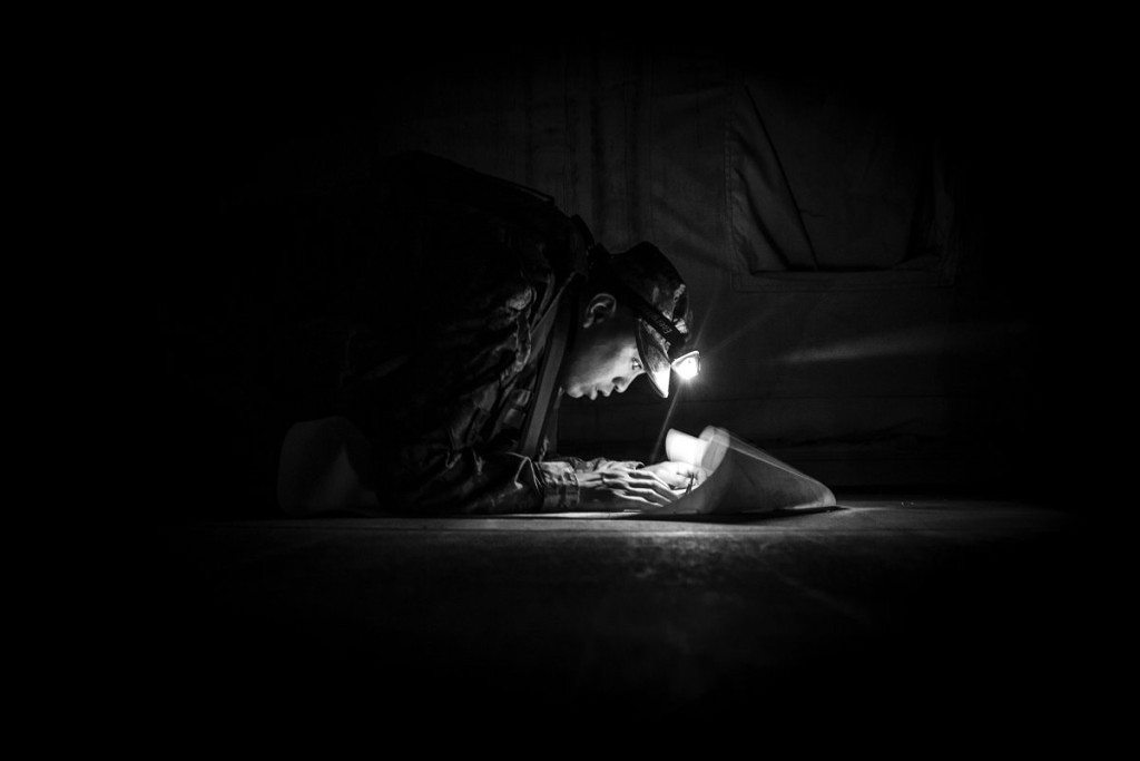 Sgt. Timothy Martin, a native of Waipahu, Hawaii, wheeled vehicle mechanic, Company B, 204th Brigade Support Battalion, 2nd Armored Brigade Combat Team, 4th Infantry Division, prepares to conduct night land navigation during the brigade’s 3-day-long Soldier and NCO of the Year competition at Camp Buehring, Kuwait, on April 23, 2014.