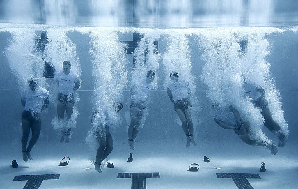 Members of the Special Tactics Training Squadron enter a pool with their hands and feet bound. The drown-proofing exercise teaches students to remain calm in the water during stressful situations, skills that may prove vital during real-world operations.