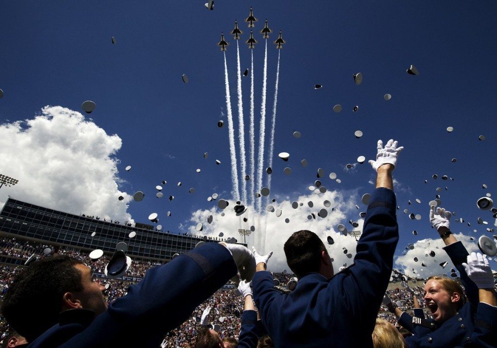 The US Air Force Thunderbirds fly the Delta formation over Falcon Stadium during the US Air Force Academy Graduation Ceremony on May 28, 2014.