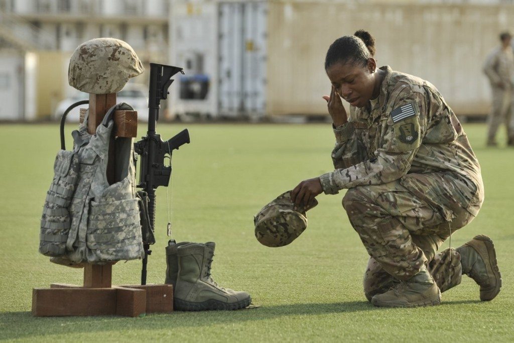 US Air Force Master Sgt. Tiffany Robinson, assigned to 449th Air Expeditionary Group, kneels in front of a battlefield cross following a Memorial Day ceremony at Camp Lemonnier, Djibouti, on May 26, 2014. The cross was created with combat gear representing each of the five US military branches, in commemoration of fallen service members.