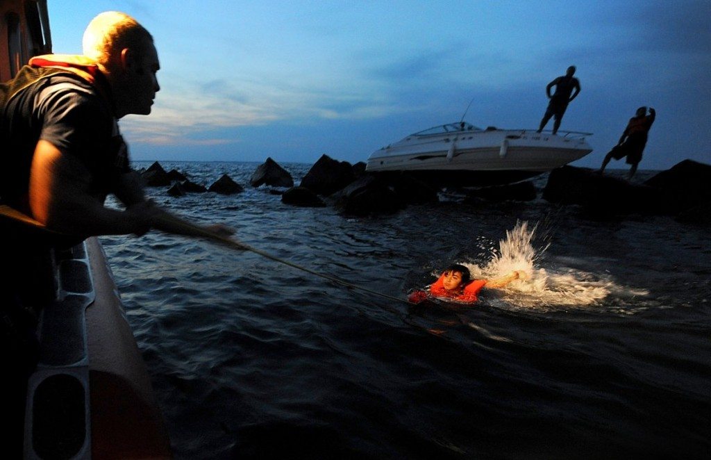 Petty Officer 3rd Class Joshua Zartman of Coast Guard Station Mayport, Florida, pulls 10-year-old Nmir Ali Mahmoud toward a Coast Guard boat while rescuing him, his father and another man who were stranded aboard their 21-foot boat after running it aground on top of a jetty near Mayport, May 24, 2014.