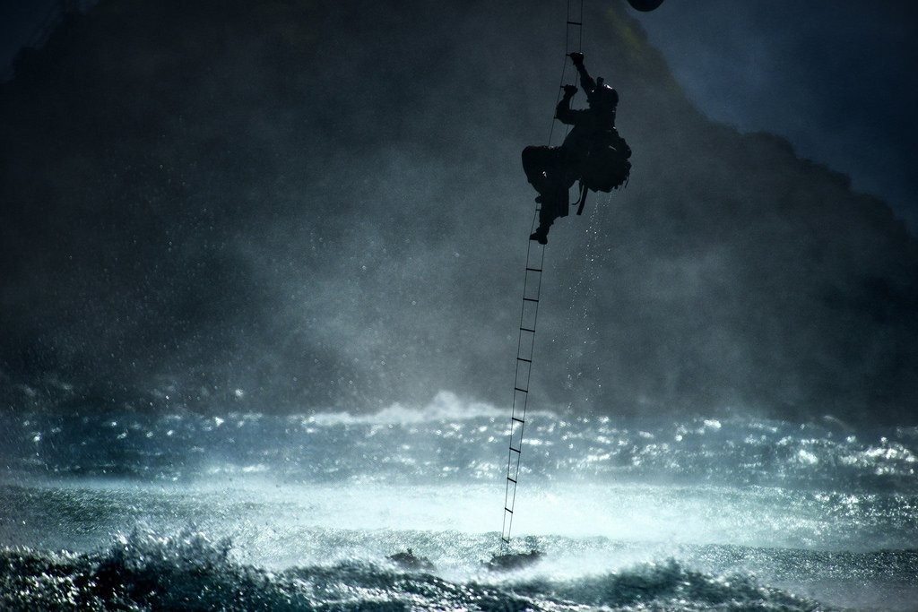A 22nd Special Tactics Squadron Airman climbs a ladder into a CH-47 Chinook helicopter hovering over the ocean on June 20, 2014.