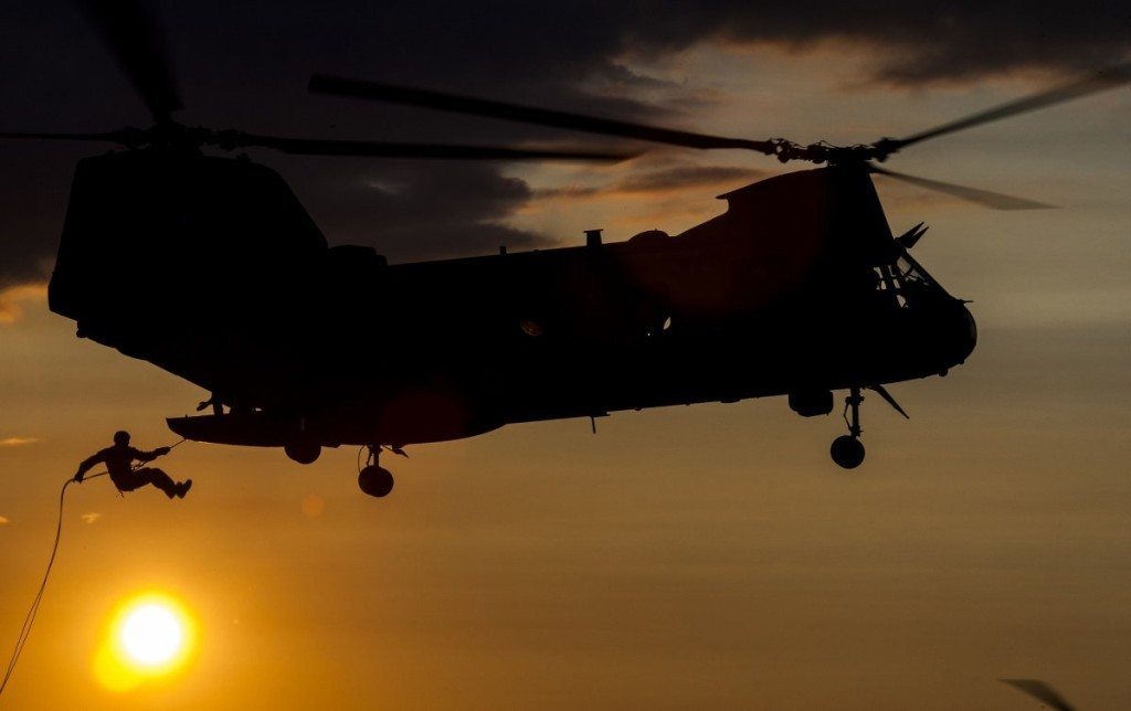 A US Marine assigned to Echo Company 4th Reconnaissance Battalion rappels out of a CH-46E Sea Knight helicopter at Camp Upshur, Marine Corps Base (MCB) Quantico Va., July 17, 2014. The training exercise was part of a week-long jump, dive, breach, and shooting package conducted around MCB Quantico.