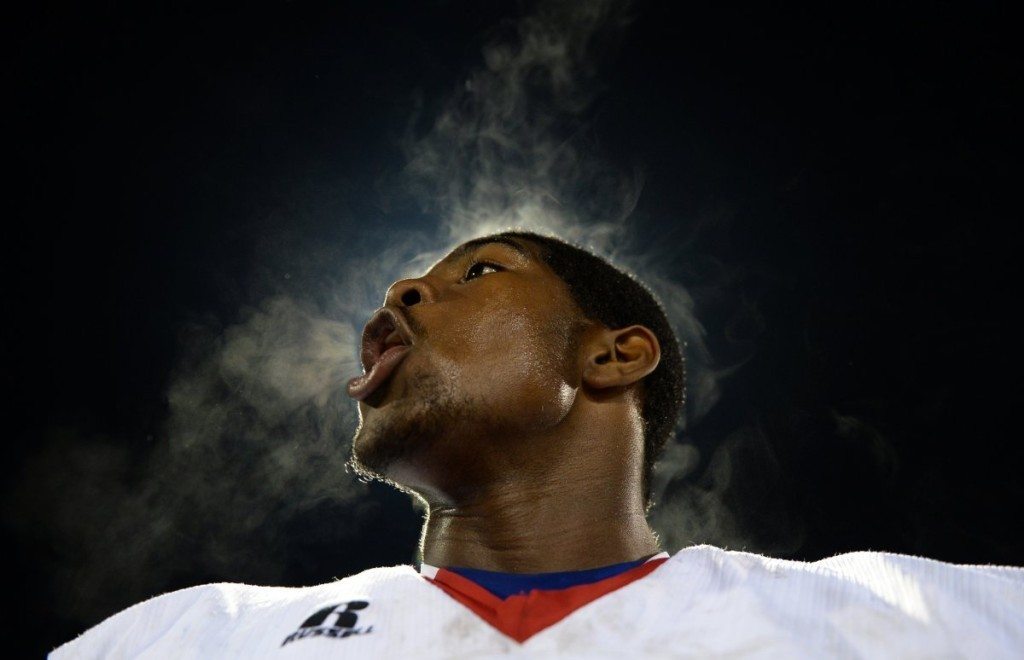 A player for the Fort Dorchester High School Football team yells to motivate players in a hostile regional game against Bluffton High School at Bluffton High School Stadium, Oct. 24, 2014.