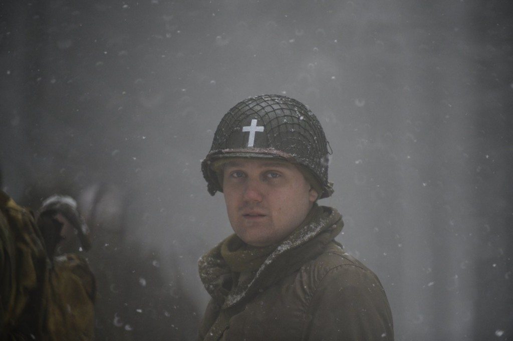 A Polish World War II re-enactor portrays an army chaplain with the 106th Infantry Division in the same forest the 106th fought in 70 years previously during the Battle of the Bulge, on Saturday, Dec. 13, 2014.