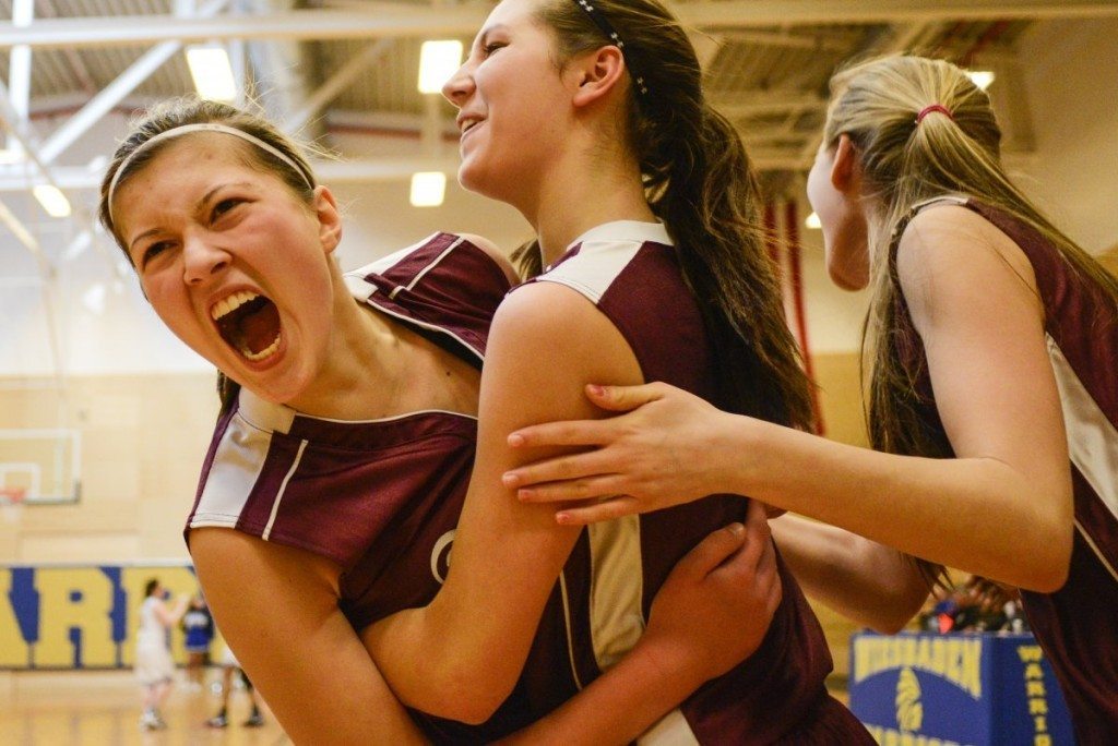 AFNORTH’s Eliska Volencova reacts with teammates Erica Balkcum and Emma Rainer after coming back from 10 points to defeat Hohenfels 22-19 in the DODDS-Europe basketball championships Division III semi-final game Friday, Feb. 21, 2014.