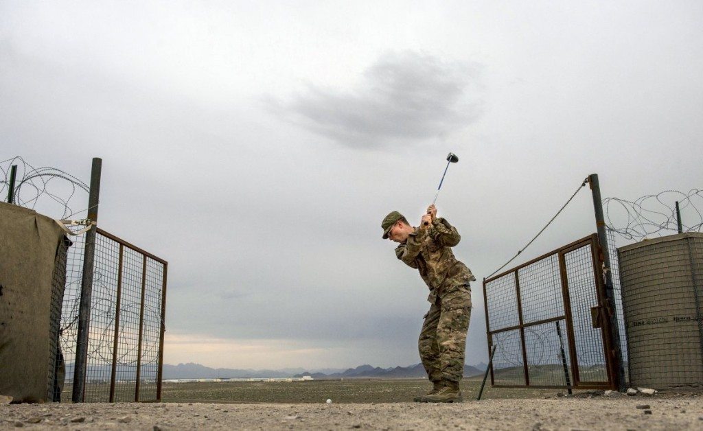 A US Army soldier swings a golf club after duty on March 29, 2014.