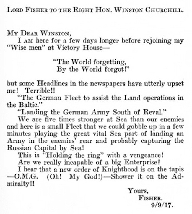 In 1917, Lord John Fisher, who resigned his commission in 1915 over Churchill’s Gallipoli Campaign during the First World War, wrote to Churchill who was then Minister of Munitions about his concerns regarding the Navy’s ability to conduct a major campaign to keep the Germans from flanking the Russians via the Baltic Sea.