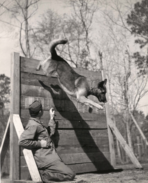 On November 26, 1942, the Commandant of the Marine Corps penned a letter to the Commanding General, Training Center, Fleet Marine Force, Marine Barracks, New River, North Carolina, which was redesignated Camp Lejeune the next month. In it, the Commandant dictated for the General to “inaugurate a training program for dogs for military employment when personnel and material become available.” At that time, 24 Marines were in dog-related training at other bases and would bring 42 Army dogs with them back to New River. The Commandant noted that a further 20 dogs would be procured by Miss Roslyn Terhune, given obedience training in Baltimore, Maryland, and shipped to New River around the end of January 1943.