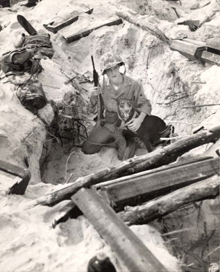 The first Marine Corps dog unit sent to the Pacific was the 1st Marine War Dog Platoon. Sailing from San Diego, California on June 23, 1943, the Marines and their dogs arrived in the South Pacific on July 11. In November, the platoon was attached to the 2d Marine Raider Regiment during the Bougainville operation. This was the war dogs’ trial by fire and they exceeded every expectation. The official report of the Commanding Officer, 2d Marine Raider Regiment (Provisional) states: