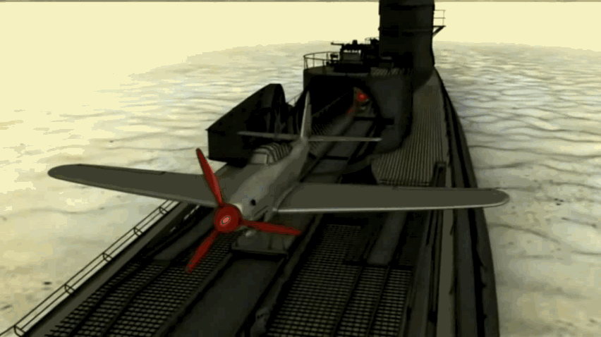 The planes landed on the water and were recovered using a crane on the deck. The M6A1 Seiran torpedo-bombers were designed for the I-400. They had wings that rotated and folded along the fuselage and even the tail folded down to fit in its tiny hangar.