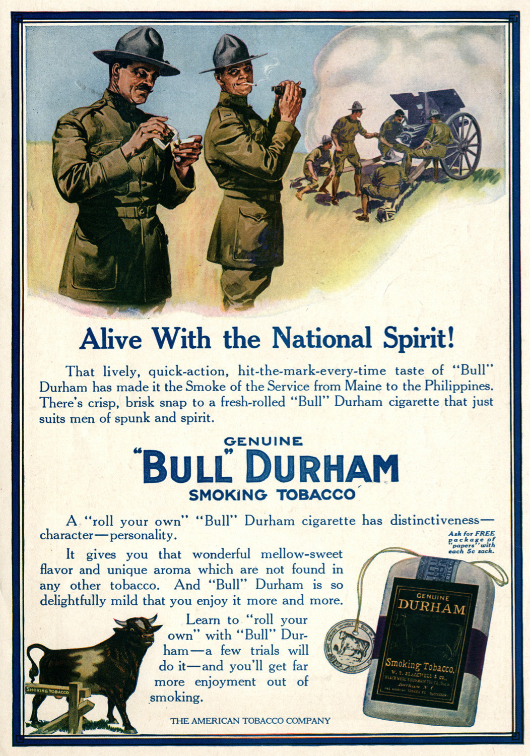 Bull Durham, another renowned tobacco brand, was frequently pushed to American soldiers and was known as the Army’s global cigarette. These commercials incorporate patriotism and the zeal with which soldiers live their lives into their sales pitches. Bull Durham advertisements were part of the reason the brand was so popular and preferred among many soldiers. Even those at home would often resolve to smoke the brand’s cigarettes in the attempt to feel what the front liners were going through.