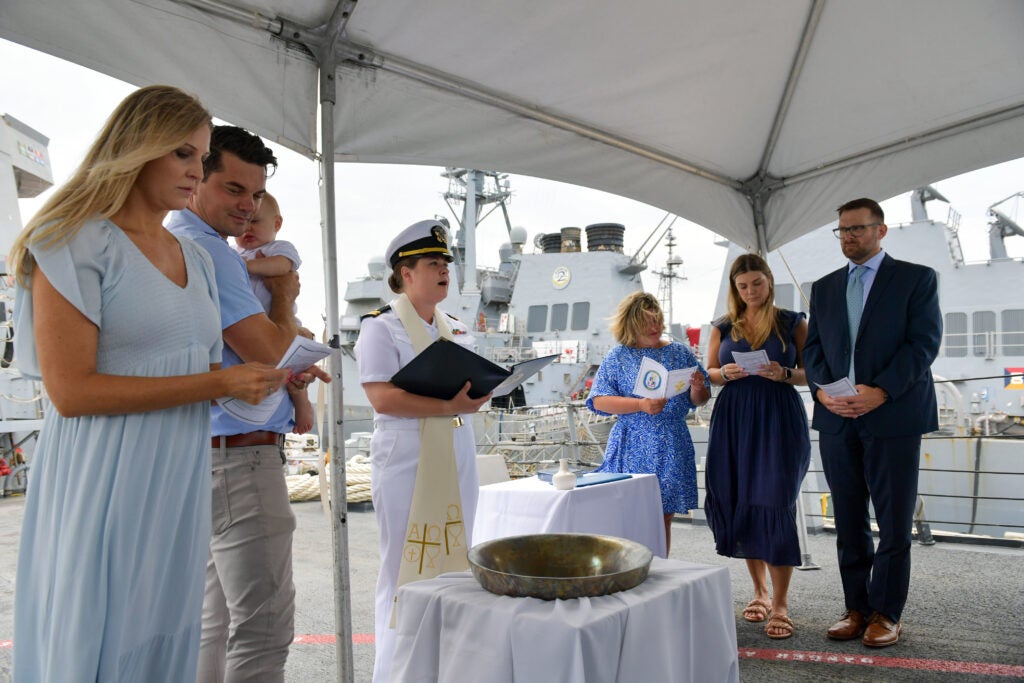 The first namesake baptism aboard the Laboon was that of Liv Malone Laboon, Father Laboon’s great-grandniece, on August 28, 2018.. Her bell baptism was performed by the ship’s chaplain, Lt. Mark Cook. Moreover, the baptismal water was a special composition of saltwater collected from every body of water that the ship operated in on its last deployment. “In a sense, now, she has traveled with us on our most recent deployment, not only by her name, but now symbolically through the water we have collected,” Lt. Cook told WTKR. In keeping with tradition, her name was engraved on the ship’s bell.